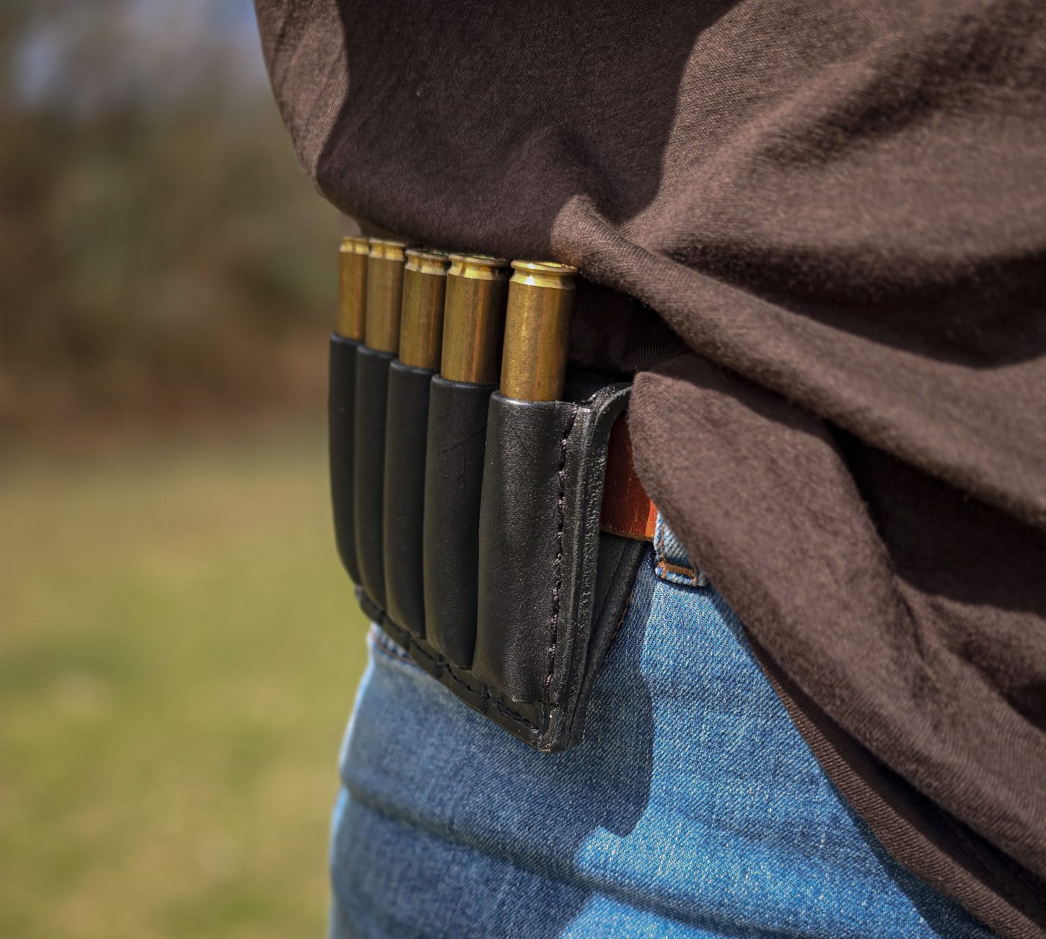 Ideal for hunting, safari use, range shooting, and general field carry, this leather ammo slide offers a reliable and traditional way to carry extra rifle ammunition, combining durability, functionality, and classic leather craftsmanship.
