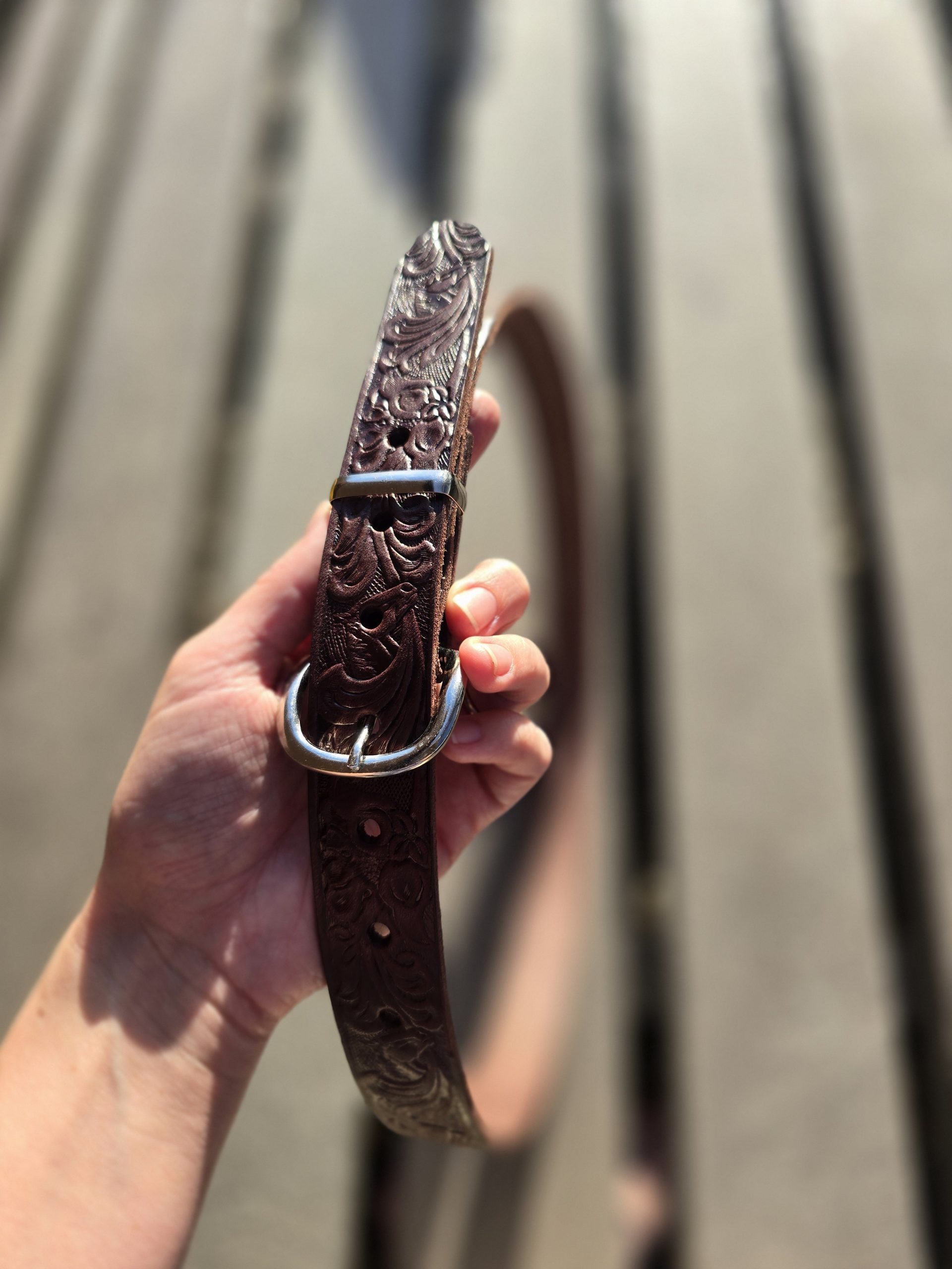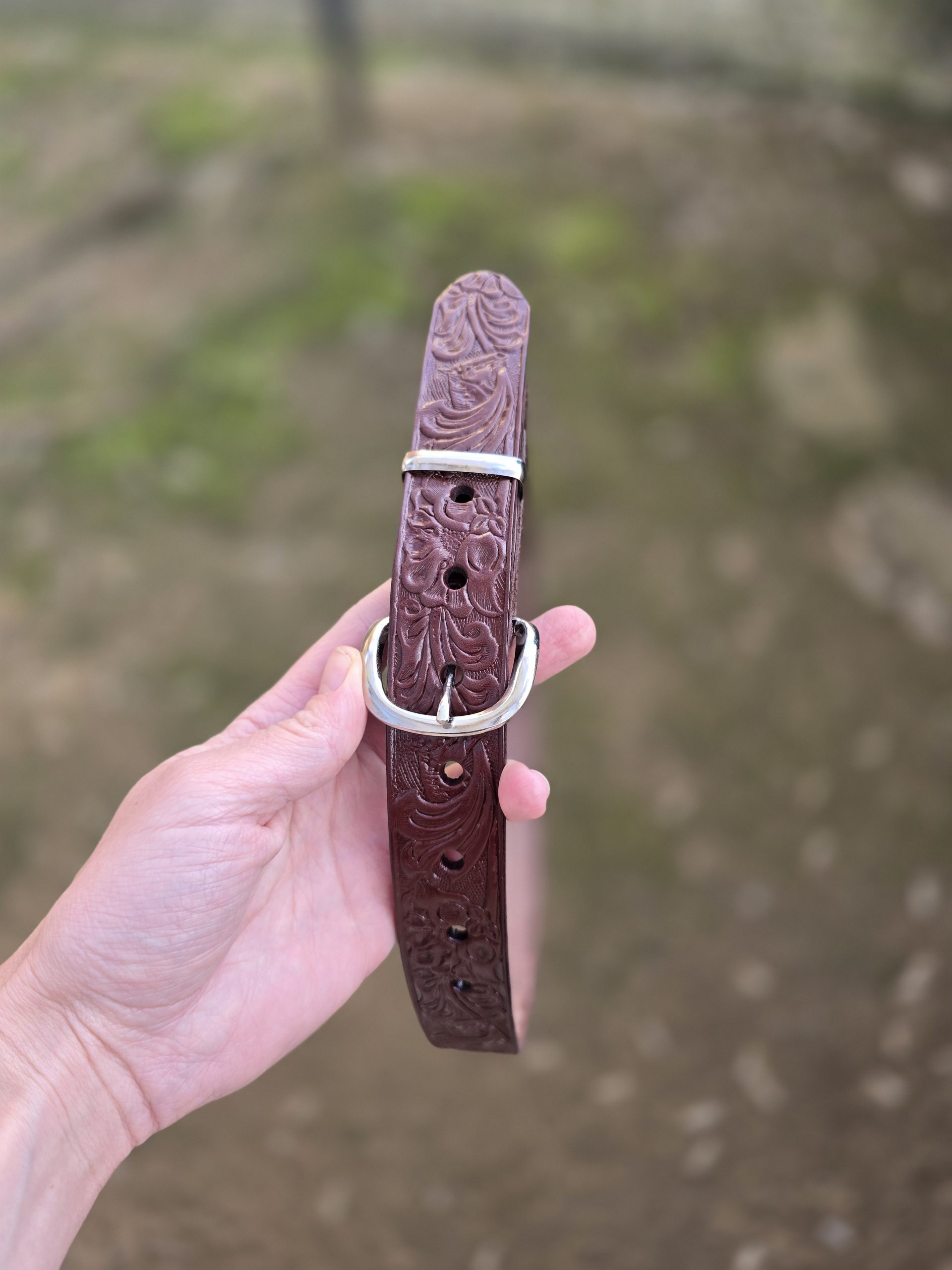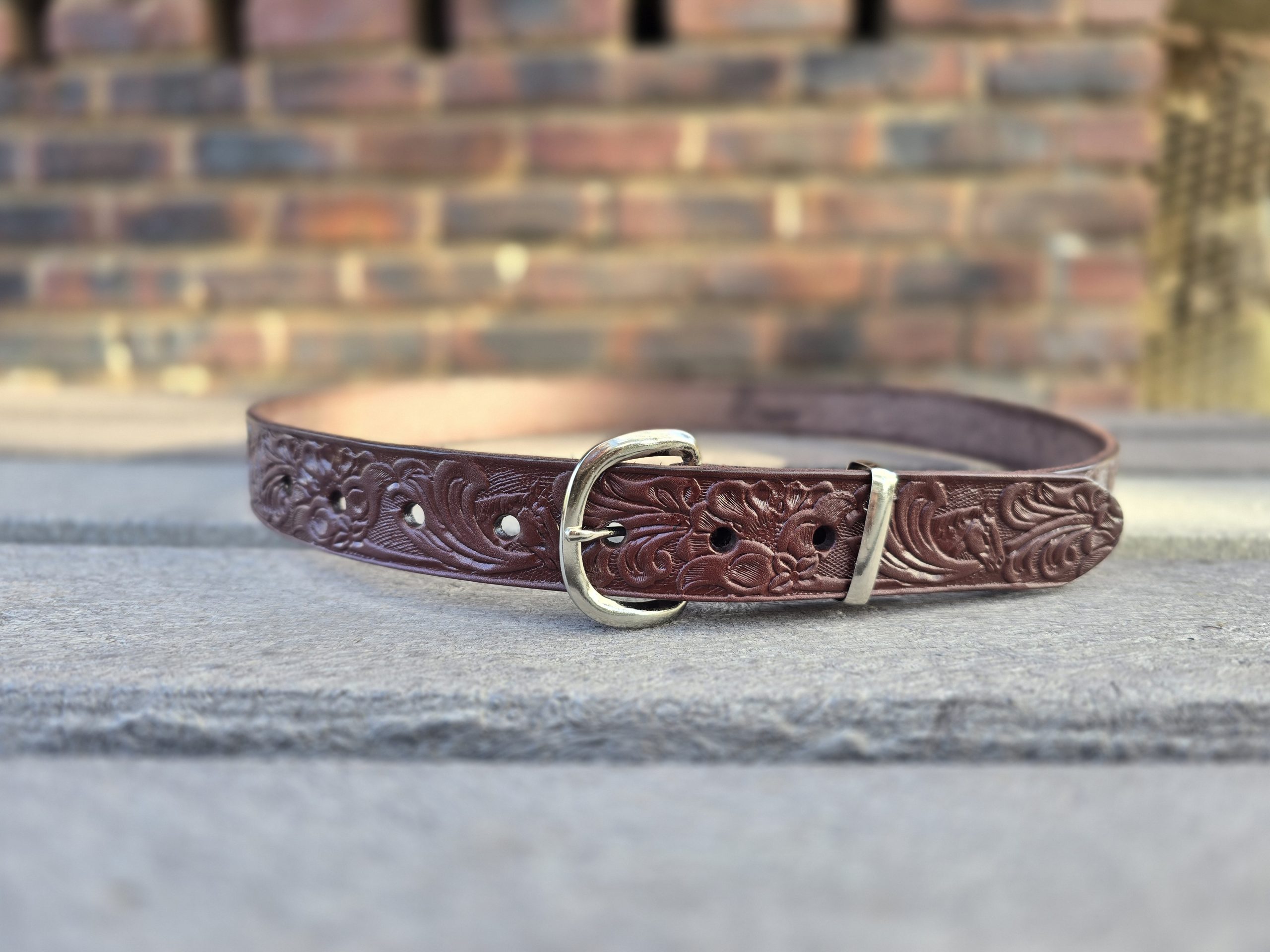 30mm floral embossed leather belt with a classic vintage design. Crafted from quality leather with detailed floral embossing for a stylish textured finish. Slim 30mm width makes it ideal for both casual and smart wear. Durable, versatile, and timeless—perfect everyday leather belt for ladies.